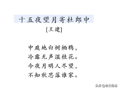 出自《十五夜望月寄杜郎中》是唐代诗人王建创作的一首以中秋月夜为内容的七绝。全诗四句二十八字,以每两句为一层意思,分别写中秋月色和望月怀人的心情,展现了一幅寂寥、冷清、沉静的中秋之夜的图画。此诗以写景起,以抒情结,想象丰美,韵味无穷。
