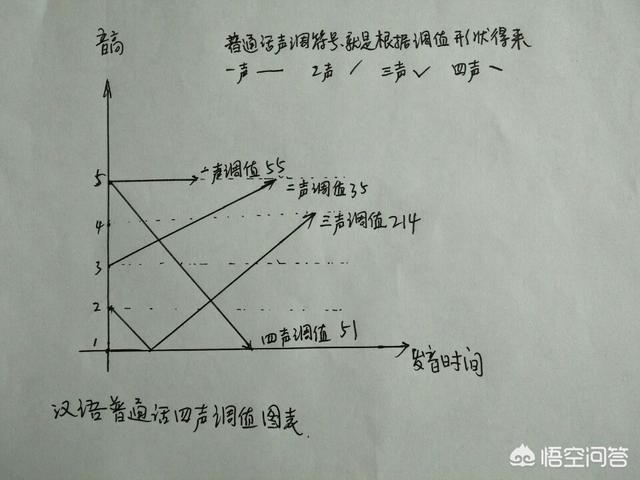 从上图可以看出,汉语普通话第一声的调值是55,特点是音高很高,发音很平,叫一声高又平。二声的调值是35,发音特点是,先稍低,然后向上扬,二声向上扬;三声的调值是214,发音特点是,起初稍低,慢慢向下沉,然后再向上扬,三声拐个弯。四声的调值是51,起始很高,迅速下降。从5降到1,叫四声降下来。